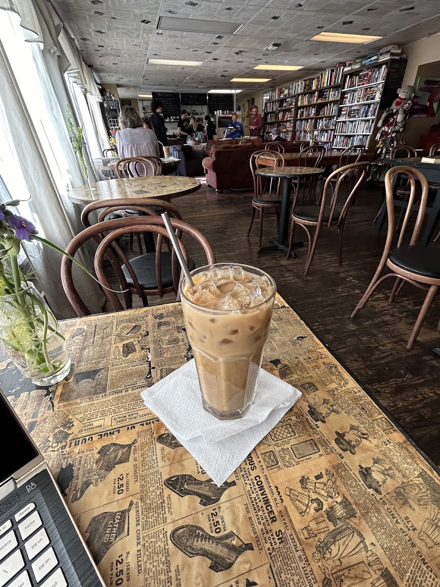 It's a great cozy little coffee shop with walls of books! If you love books, this is the place for you! There's even bookshelves full of books in the restroom! The coffee is good and the two girls manning the shop were incredibly nice and totally adorable! Eclectic Bohemian vibe. There are a few tables and chairs and two huge comfy couches! My brother and I sat there and talked for two and a half hours! We only left because they were closing. They don't have food. Only a couple of muffin choices. If you like laid back and comfortable, then this is a must try.